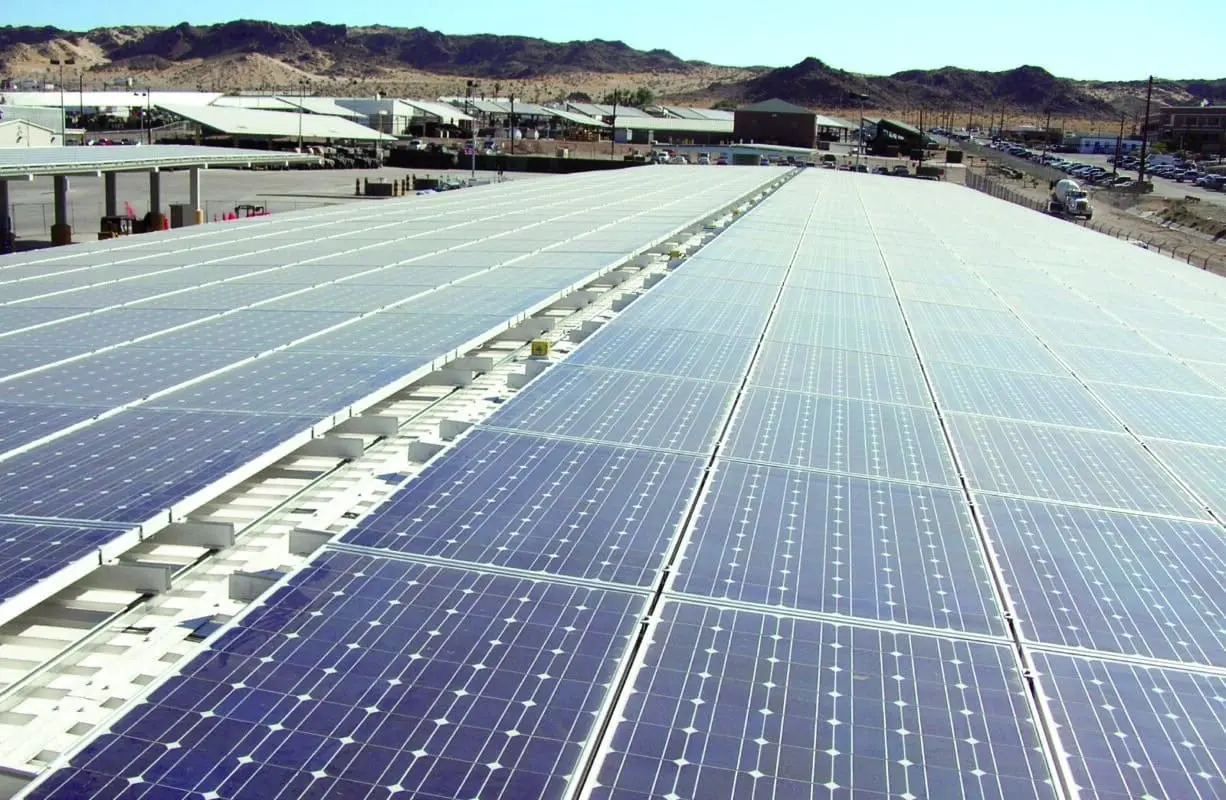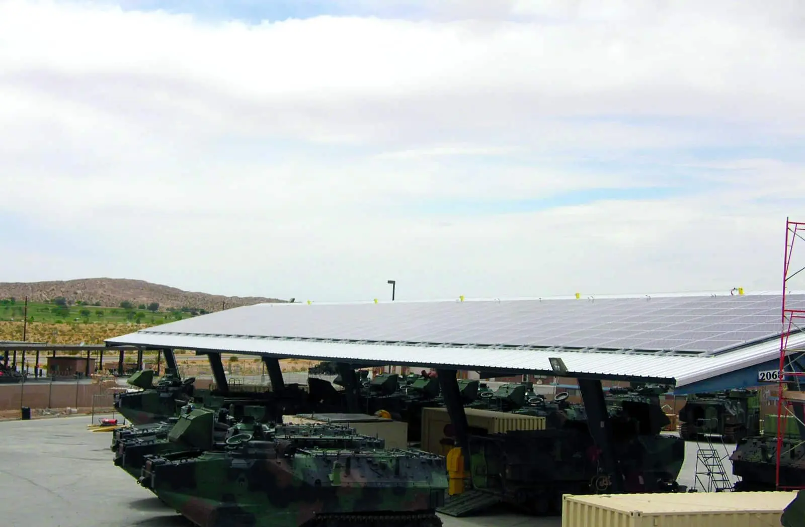 This $3.4 million fast track design-build project consisted of designing and installing 2,464 Sharp 235 W modules on five (5) existing vehicle canopy structures used to shade the Marine Corps tanks and armored vehicles at the Marine Corps Air Ground Combat Center in Twenty-nine Palms, California. This project is part of the American Recovery & Reinvestment Act (ARRA) of 2009, which aims to reduce carbon footprints through renewable energy. The locations of these vehicle canopy structures were occupied on a daily basis by the military necessitating strict coordination for the safety of the user group. This was a key factor to the project’s overall success.