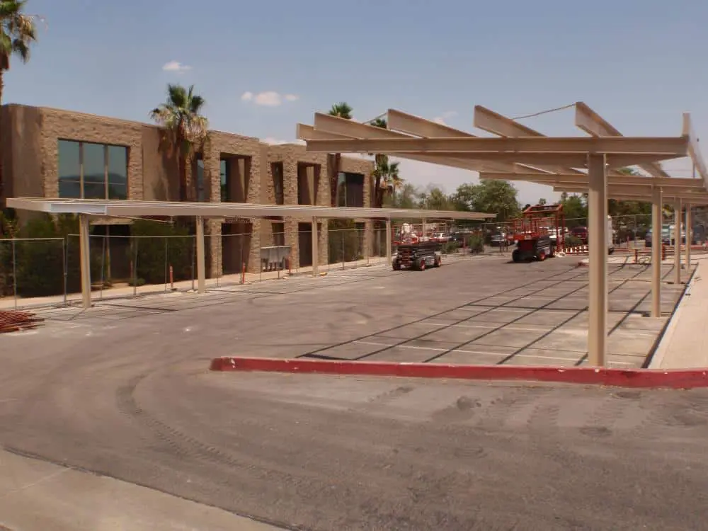Stronghold Engineering, Inc. is partnered with the City of Palm Desert to engineer, procure and construct solar photovoltaic power systems (SPVPS) on the roof of the corporation yard office building and construct a photovoltaic parking structure at the Parkview Office Complex in Palm Desert. The components for these systems were comprised of top quality and American made products in accordance with the ARRA “Buy American Act” and went through rigorous testing and commissioning procedure in accordance with the California Energy Commissioning guidelines for PV systems to prove the systems met and exceeded the owner’s requirements. Owner representatives are trained on the systems for safety precautions, fall protection requirements, system operation, and maintenance requirements. The systems will generate an estimated 135,471kWh during their first year of operation and an estimated 3,191,148kWh over 25 years. These SPVPS will supply power to each building, as well as, feed energy back into the power grid when there is an excess of electricity produced. The buildings are now expected to save tax payers up to $25,000 a year in energy costs.
