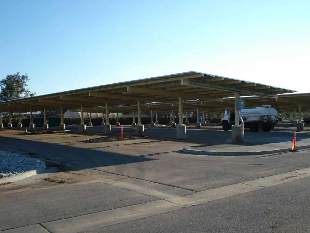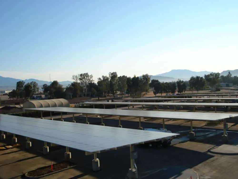 This photovoltaic (PV) array project consisted of the installation of a PV System at March Air Force Base in Moreno Valley, California. This 413.38kW system sits atop five (5) carports located on the base. As constructed, it is expected to have an annual energy production of 711,690kWh and will decrease the base’s energy costs by more than $650,000 annually. With respect to the PV’s superstructure, the carport was designed and installed with concrete footings and an attached steel structure, which was connected to the solar panels. The solar panels are connected in a series and feed power back to an inverter that changes the collected DC power to useable AC power for the adjacent building. When the power consumption demand at the building does not require the full output load from the solar panels, the unused power is distributed to Southern California Edison (SCE) via the power grid connection. This nets March AFB a cost savings rebate form the local utility company from surplus power produced by the system.