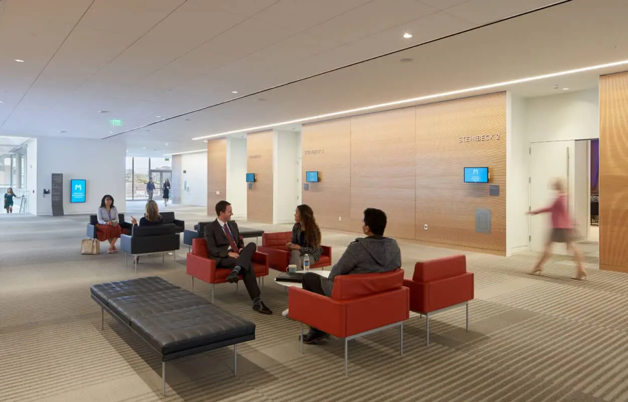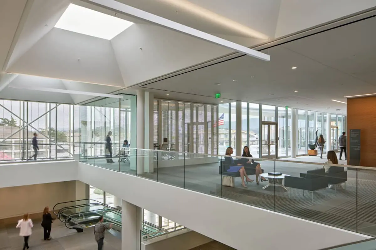 The project restores the 40-year-old facility as a hub of activity in the heart of downtown. The new Conference Center simultaneously embodies and facilitates connectedness—of people and ideas, of downtown businesses to waterfront amenities, and of a community to its future. The project transforms the Center into an inviting, light-filled civic gateway for visitors and residents. Inspired by the iconic elevated wraparound porches of the Monterey style, a cantilevered envelope of perforated steel and transparent glass replaces the former concrete and stucco facade to open the municipal facility to its surroundings. The enlarged lobby with its double-height glazing becomes an active ground floor that welcomes event attendees. Its design energizes the adjacent Portola Plaza, which is reconfigured to be a vibrant, outdoor extension of the Conference Center and strengthen pedestrian access from downtown to the waterfront. In the evenings, the building will radiate a warm glow into the plaza as light washes over the building’s second-story wood and glass screens.