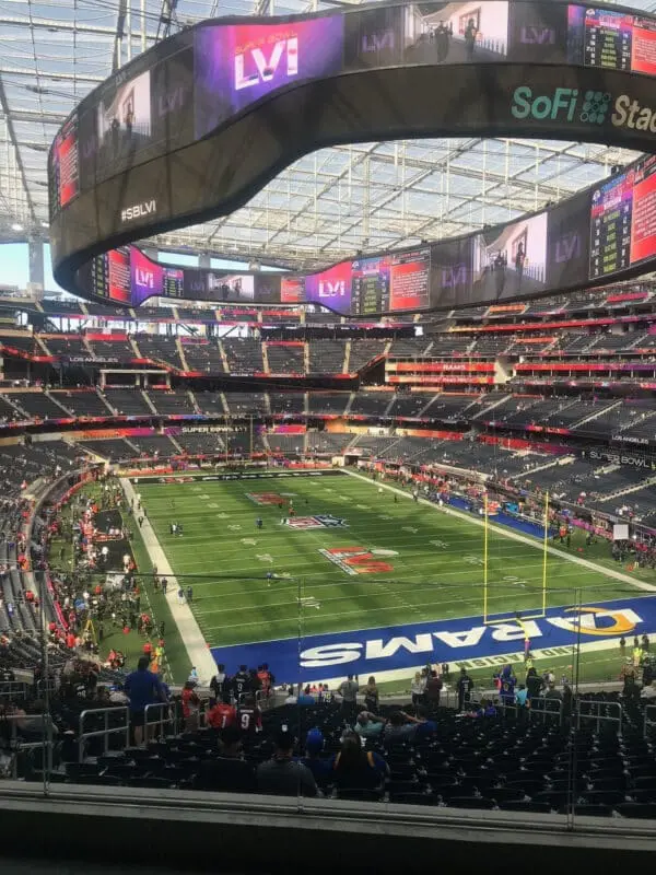 When we made it to the search/screening area -they scanned the tickets and let us in–they never asked us for our vaccination cards and very few people wore masks. The Vibe there was so amazing-so positive! Everyone was on the same wavelength. As we came up to the entrance of the stadium- I was amazed at how big it actually is and how beautiful it is. They designed and built this stadium so well- at no time did I ever feel it was too crowded even though it was at max capacity. When we walked up to where we can see the field below- I was awestruck! I AM actually at the SUPER BOWL!