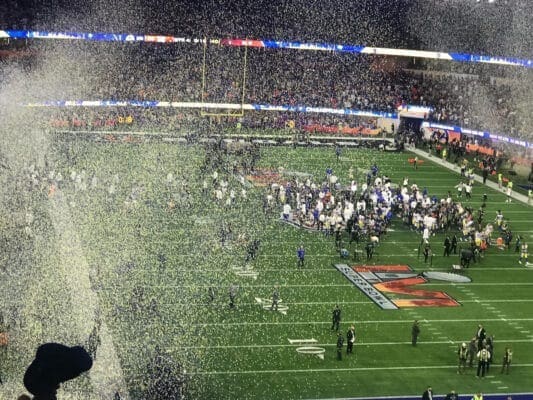 First off, I was in total shock when the wheel landed on my name! My first thought was, there must be some mistake or malfunction because I never win these kinds of contests. I was overwhelmed and it took a few seconds for my brain to catch up to reality. When I was in Alyssa’s office talking about winning the tickets, I could see Keith at the bottom of the screen and instantly knew the other ticket was for him. I told Alyssa right away Keith was going with me. When I told Keith he gets the other ticket – his reaction was priceless!! Full of emotion, He yells – ‘I’m going to the SUPER BOWL!’ and a few other choice expletives!
